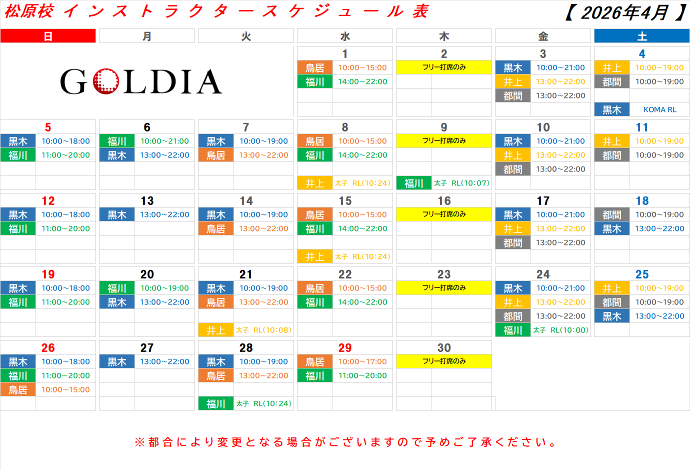 4月インストラクタースケジュール更新