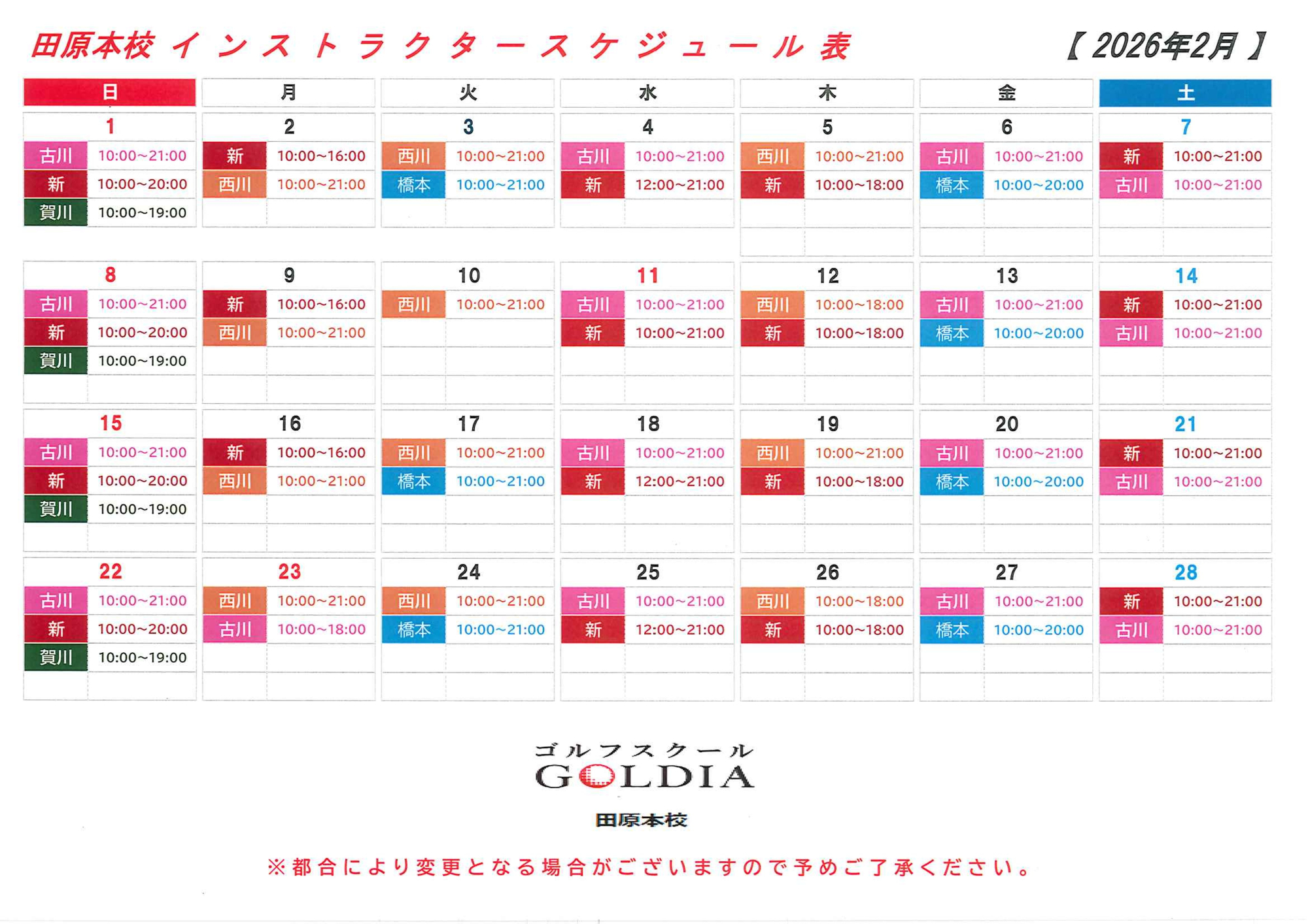 2026年2月インストラクタースケジュール更新!